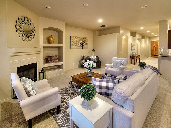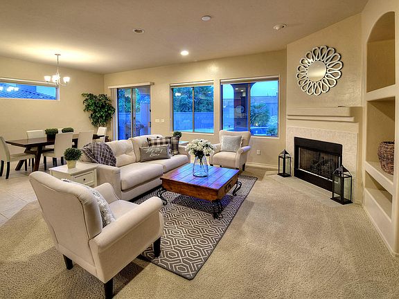 * Light and airy 4 bedroom, 2 bath, 2,133 sq. ft. patio home in sought after, gated The Villages of La Paloma with its own pool and spa. Foyer entry with high ceiling leads to great room with wall of glass, corner fireplace, dining area, breakfast bar, and kitchen with Corian countertops and cherry wood cabinetry. Gracious master suite offers walk-in closet, dual sinks and garden tub. Additional features include neutral ceramic tile and carpeting throughout, 2-car garage, back patio with pool & spa with waterfall and covered porch. Walk to the community pool and facility.