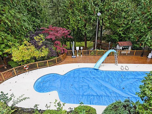 Open 11-18, 1-3pm. Entertainer's dream home! Huge windows with views of trees from almost every room. Spacious kitchen will let you host many guests. Formal living and dining rooms with upper deck. New roof, carpet and paint. Family room with theater & bar. Decks, pool, amazing play structure, stream and grassy area for outdoor fun. 2nd storage/shop area 14x25.