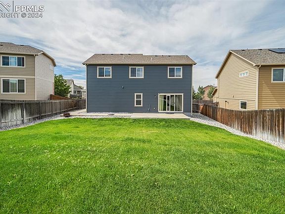Beautiful home in great location with easy access to Powers Blvd, military installations, and nearby trails at Bluestem Prairie Open Space and Big Johnson Reservoir. Desirable upgrades throughout, including lovely hardwood flooring on the main level. Spacious Kitchen with granite countertops, tile backsplash, stainless steel appliances, wall pantry and recessed lighting. Large Dining Room with mountain view, and plenty of space for a hutch or buffet. The Family Room includes built-in speakers, a ceiling fan, and walkout to patio and backyard. Large Laundry Room with folding counter and storage area. Plus a Powder Room for guests. Upstairs, you'll find four nicely-sized bedrooms and two full baths. The Primary Bath includes a double vanity and soaking tub with upgraded showerhead. The Primary Bedroom also includes an 8x6 walk-in closet and a ceiling fan. Bedrooms 2 and 3 with overhead lighting. Bedroom 4 features a ceiling fan and has a view of the mountains. The Upper Full Hall Bath includes an oversized countertop and vanity. The Unfinished Basement is great for storage or potential for future expansion (approximately 20x15 sq.ft.). Large, fenced backyard with well-tended lawn and automatic sprinkler system, as well as an expanded concrete patio for great outdoor living. You'll love the 3-Car Tandem Garage with plenty of space and side yard access door. Garage door opener motor, sensors, track and control/remote are brand new (2024). Extra features of this home include Central Air Conditioning, humidifier, sump pump and faux wood blinds. Plus a nice, quiet street to enjoy from your cozy front porch. Truly a lovely home!