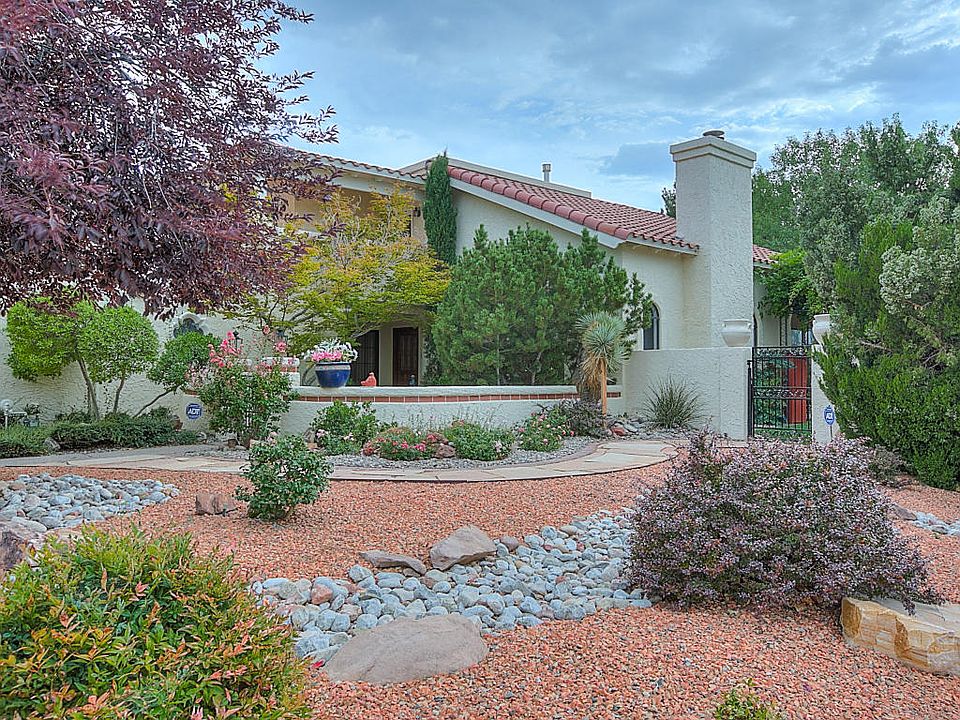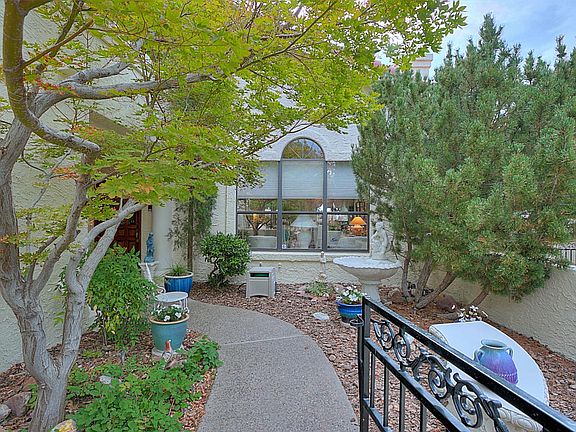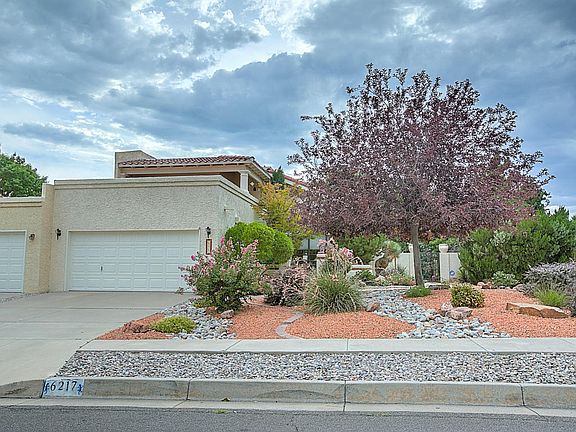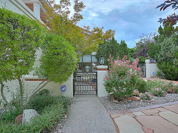 Academy Ridge Exclusive Area of Custom Homes. Walk to Tanoan Country Club,Golf Course and schools. Lush landscaped Corner View Lot with private front courtyard with fountain ,tiled porch entry,and large lush professionally landscaped backyard with patio,large flowering trees,raised walls for privacy. Foyer overlooks spacious greatroom with raised ceiling custom fireplace and great views. Formal Dining room open to Living Room . Charming Kitchen with lots of cabinet and counter space,breakfast nook with access to patio and back yard. 2 Guest bedrooms down with ample closet space and access to full bath. Guest bedroom/study has sliding doors to front courtyard Separated MBR retreat with walk in closet , private bath and View Deck . Proudly maintained Upstairs loft introduces MBR.