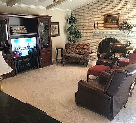 Beautiful & Well Kept single story! Open plan w/ lots of storage & perks. There is a built-in desk in the kitchen. Wet bar has a Kitchen-Aid ice maker & looks into the den. Perfect for entertaining! Upgraded features such as roman shutters, crown & dentil moldings above door casements. Hardwood flooring in hallways. New carpet in living area. Primary bath has two vanities w/ tiled shower + jetted tub. Dual closets - one cedar. Lovely yard w/ fence around pool. Outdoor storage building. New grass done soon