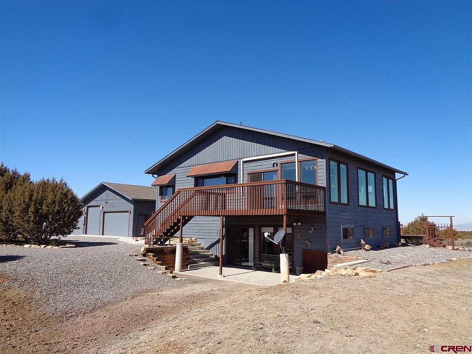 SPACIOUS HOME WITH AMAZING VIEWS Now vacant and ready for you to move right in. Beautiful well-maintained home situated on 41 acres 10 miles southwest of Montrose bordering large BLM tract. Tri-level home with open floor-plan. Spacious Great Room on upper level, 3 bedrooms and 2 full baths on ground level. Walk-out basement can be family room, exercise room, craft room or office which could easily be converted to additional bedrooms. Enjoy the views from the plentiful windows or go outside on the large balcony off the Great Room, from the deck off the Master Bedroom or on the covered patio from the walkout basement to watch the wildlife and see gorgeous sunrises and sunsets. Wonderful serene and tranquil high desert setting. Large detached 4-car garage with workshop area plus additional RV storage building and 8'x10' shed. Minimal covenants with association for road maintenance. The Virtual Tour shows pictures of the home as vacant.