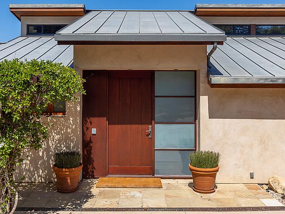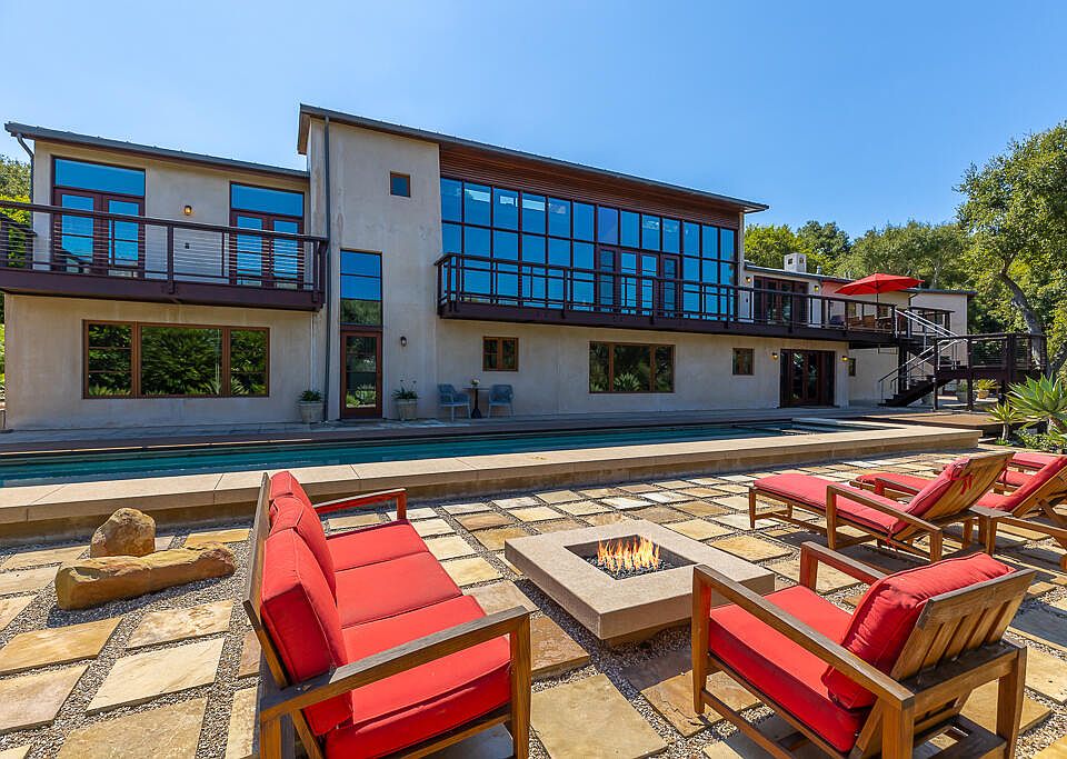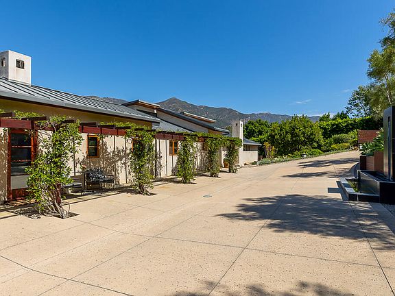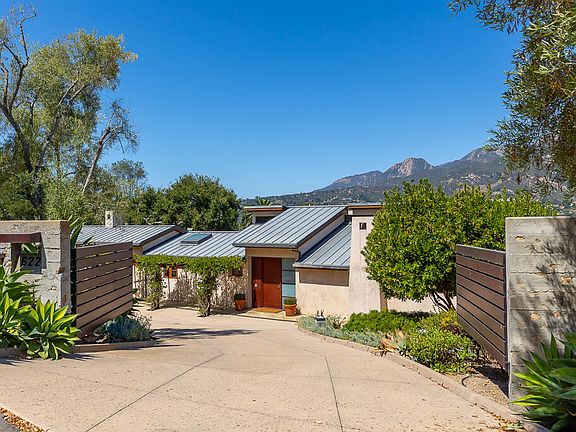 Gated and private, this sophisticated and elegant lightly furnished contemporary-style home offers stunning mountain views, vaulted ceilings, oak floors, teak and mahogany appointments, and a gourmet kitchen with great room, fireplace, and plentiful storage. The main level offers generous public rooms, a spacious primary suite and guest bedroom, outdoor dining area with barbecue, and an expansive view deck. The lower level has two guest bedrooms, media room / office with half bath, and entertainment terrace with inviting fire pit, pool, and spa under one electronic cover. Mature trees add to the parklike setting. Located in Montecito's Cold Springs School District.