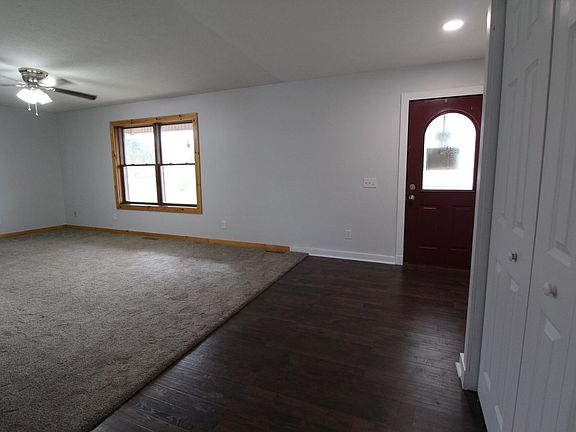 Spacious ranch home, built in 2002 and situated back off the road, on two lots equaling (approx.) .70 acre+/-. This home offers 1560 sq. ft. of living space with a nice and easy layout; beginning with an open and inviting entry, the living room is off to the right offering plenty of natural light, and down the hall are two nice sized bedrooms, one full bath with a double vanity sink, and an Owner's suite with full bath. The heart of the home features a large, warm and open kitchen/dining room with plenty of beautifully refinished cabinets and Pergo wood flooring. The exterior features a rear gravel parking area, a spacious front porch that's perfect for watching the parades across the street, there is a rear spacious two tier wood deck and two car attached garage with shelving units. Updates within the last five years include: Tub/toilet/faucet in owner's bathroom, new ceiling fans throughout, Pergo wood floors in entry, dining and kitchen areas, wood planks have been replaced on the rear deck, kitchen recessed lighting installed, refinished kitchen cabinets and new sink, new rear sliding door with enclosed blinds, and a brand new 98% energy efficient furnace and a/c unit. This one will go fast, call your agent today. This home has public water and sewer.