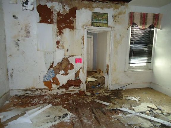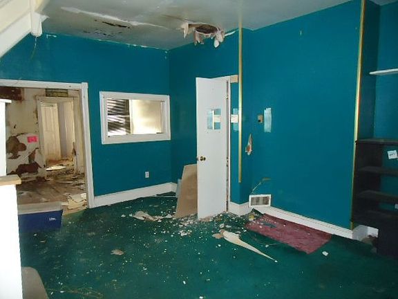 Exterior Features:Exterior is Green in color. Roof is of flat tar type. Roof shows signs of moisture and soft spots. Siding in moderate condition. Yard requires cleanup. Some windows require replacement. Windows are of wood frames.Interior Features:Interior needs extensive work. Living room in poor condition. Kitchen need extensive work. Bedrooms need work, Bathrooms need extensive work. Carpets or flooring need to be replaced. Carpet or floors are soiled. Garbage or debris present. Some bathroom fixtures are missing. AC Unit missing, Electric needs work, Water Heater missing, Water pipes show breaks in places. Mold present and face mask required, Ceiling shows extensive water damage. City Water Service.