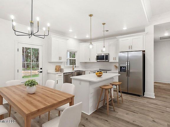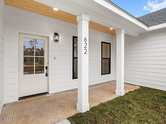 Welcome to 622 Edna St in Waveland, MS—a stunning new construction 3-bedroom, 2-bathroom home that exudes modern elegance. The exterior showcases a striking white design with black accents, while inside, an open floor plan seamlessly connects the living, kitchen, and dining areas. Hardwood floors flow throughout the home, including the spacious bedrooms. The kitchen is a chef's dream with sleek white cabinets, gold hardware, white quartz countertops, and stainless steel appliances. The luxurious primary suite features an en suite bathroom with matching white quartz countertops, cabinetry, and stylish gold accents, creating a cohesive and sophisticated aesthetic.