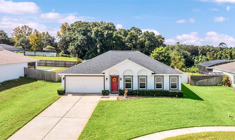 Welcome to Wekiva Springs Reserve! Nestled in a peaceful cul-de-sac this charming 4/2/2 home is a serene retreat with NO rear neighbors, low HOA with a picturesque and wooded view. The covered screened back patio provides an idyllic spot to unwind and enjoy nature's beauty overlooking your private backyard. Custom landscape paver walkway leads way to the private backyard space complete with a prepped garden space, stunning mature purple Tabebuia tree and expansive views that feel like you're on a mountaintop!