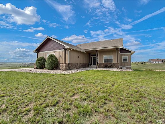 Beautiful Ranch home on 5-acre elevated lot with captivating views of Pikes Peak! This luxurious home has a 5-Star Energy efficiency rating with geothermal heating/cooling and a tankless hot water heater. Very low utility bills! Walk into the Great Room with high ceilings, large picture windows, and a stone gas fireplace. The open concept kitchen with granite countertops, stainless steel appliances, knotty alder wood cabinets, and hickory wood flooring make entertaining a dream. Laundry room off the kitchen with cabinets and utility sink. The large master suite graces the main level with tiled fireplace, dual walk-in closets and sitting area. The 5-piece master bath features dual vanity with knotty alder cabinets and soaking tub. The main level also has a secondary bedroom and guest powder room. The walk-out basement features two more bedrooms with garden level windows for bright natural light. The large rec room features walk-out access to a concrete patio. Generous storage areas with two storage rooms downstairs and a large storage closet in the hall. Custom Hunter-Douglas window coverings throughout the home, ceiling fans in each bedroom, and granite countertops in all bathrooms and laundry room. Step onto the Trex deck with access from the kitchen and master suite. Enjoy the beautiful morning sun with a cup of coffee and mountain views. Very usable land to build a shop or horse barn. All trees and shrubs are on a drip system around the home. Come see this meticulously maintained home today!