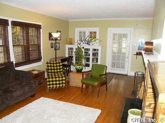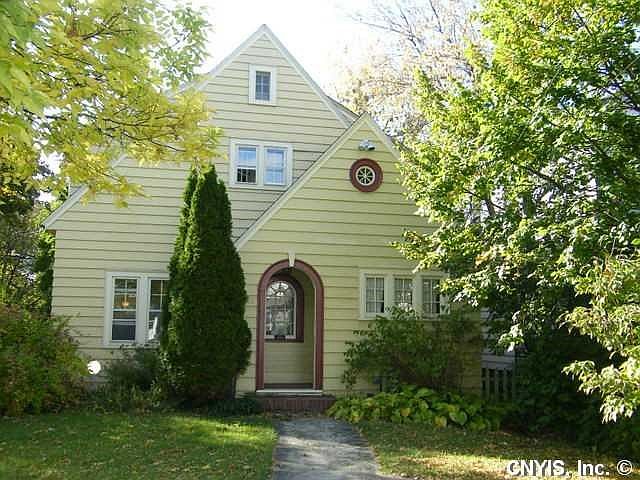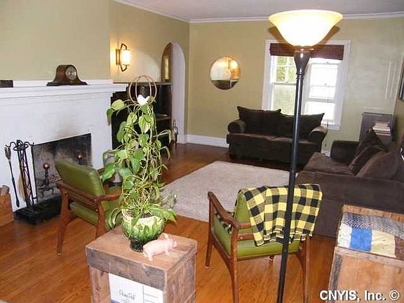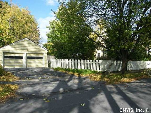 Charming East Side Colonial With A Picket Fence! Warmth and character, hardwoods throughout, welcoming foyer, large front to back living room with brick fireplace, curved archways, dining room, cozy country kitchen & three-season porch that leads to a stone patio with pergola & stone walkway through garden-like, fully fenced yard. Double wide stairs leads up to a spacious master and two other bedrooms with closets, full bath, built-in linen closet & attic storage. Two car detached garage, corner lot with trees & shrubs for privacy. Close to universities & downtown.