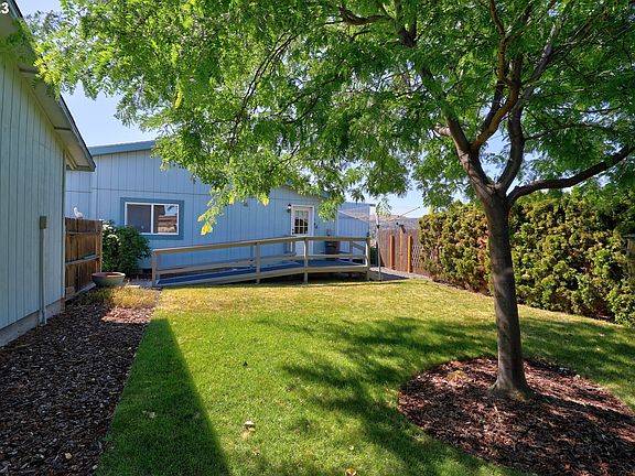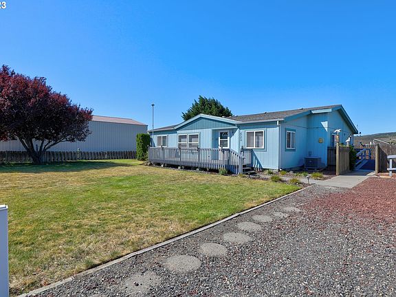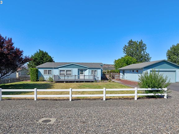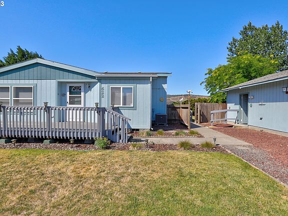 Setting on a half acre parcel, this spacious 1998 manufactured home with over 1800 Square feet of living space has three bedrooms, two bathrooms and a laundry/mud room. There are two living rooms, one has a sliding door to a covered deck facing south towards the Columbia River. It is an unobstructed view of the river and City of The Dalles. The covered deck is a great place to watch the river traffic with tour boats, barge and sporting boats traveling regularly as well as lots of wildlife including Eagles, Pelicans, Blue Heron and the occasional salmon or sturgeon jumping out of the water.The home has a large open kitchen with a floating (moveable) island and a walk in pantry. Also find a formal dining room with lots of natural light.The primary bedroom has a walk in closet, a window that views the Columbia River and a large bathroom with a tub/shower, double vanity sinks and a linen closet.The two guest bedrooms and bathroom are on a separate hallway which gives the occupants some separation and privacy.There is a 24 x 32 garage that is not attached to the home but there is a nice walkway and ramp. There is a lovely shaded private side yard behind the garage, great for picnics out of the sun and sheltered from the wind.