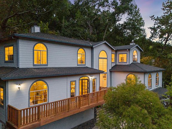 In the Highlands of Emerald Lake across from Handley Rock Park is a majestic home nestled in a terraced hillside adjacent to Edgewood Park and Natural Preserve. Tranquil treetop views from nearly every room add grounding to the homes striking white interior with lofty ceilings, modern fixtures, premium finishes and luxurious amenities. Arched windows, sleek stone surfaces, pristine oak floors, and new carpeting, light fixtures and interior paint elevate the semi-rural lifestyle. Special features: a three-story stairwell bathed in natural light; living room with polished stone fireplace and deck access; family room surrounded with arched windows; dining room with custom buffet; entertainers kitchen with 48-inch Wolf range; primary suite retreat with sitting area, walk-in closet and en suite bathroom with an elevated tub and adjoining shower; secondary suite off the living room; tree-studded grounds with extensive decking and a terraced hillside evoking communion with Mother Nature.
