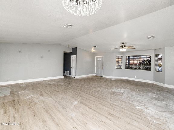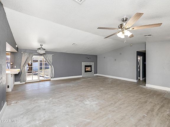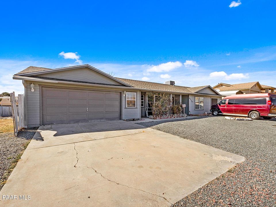 Conveniently located in Prescott Valley, opportunity knocks for the right person to purchase this single level home! The interior features an open, spacious great room concept with updated appliances, new roof, recently installed luxury vinyl plank flooring, and raised panel interior doors. The great room showcases vaulted ceilings, updated ceiling fans, and gas fireplace. The kitchen is well appointed with stainless steel dishwasher, microwave, five burner gas range, tile counters, ample cabinetry for storage, and peninsula with seating. The master suite is spacious in size and features a walk in closet and private access to the rear patio. The master bath contains a walk in shower, and single pedestal sink with plumbing in place for a second. CONTINUE The guest bedrooms are generously sized and equipped with ceiling fans. The full guest bath contains a comfort height toilet and pedestal sink. The laundry room serves as a mud room coming in off the garage and is equipped with a wash basin. Located adjacent to the kitchen is a large walk in pantry area as well as a half bath with pedestal sink and comfort height toilet. The two car garage has built in storage cabinetry and shelving. The large backyard is level, flat, usable, with RV parking capable behind the gate. The expansive covered rear patio features long distance mountain views of the Bradshaw mountain range and Glassford Hill. Additional features include: recently painted exterior, a large, level lot which accommodates lots of cars for convenient parking, and recently installed air conditioning system.