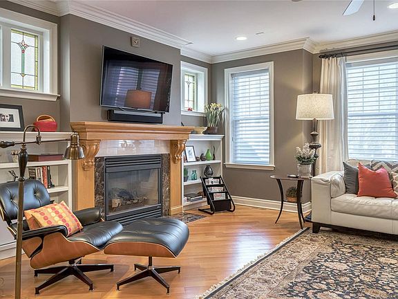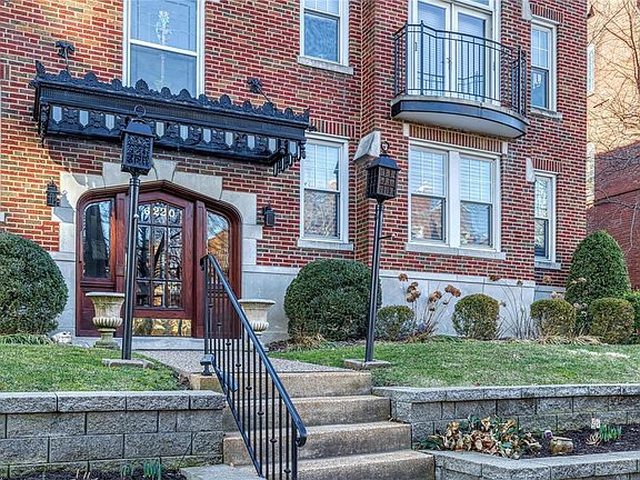 CAREFREE LIFESTYLE! Renovated condo in highly desirable DeMun neighborhood, just across the street from FOREST PARK! Historic 1928 all-brick building was completely gutted and updated in 2002. Comfort, convenience, space and style. This condo has it all: 11-foot ceilings, dramatic stone on gas fireplace, built-in bookcases, impressive windows, stained glass, large dining area, private office, and more! Be greeted by the generous entry foyer and stunning archways and architectural details. Open floor plan boasts hardwood floors throughout. Modern kitchen has granite counters, breakfast bar, walk-in pantry and stainless steel appliances. Romantic primary suite includes a spa bath and a large walk-in closet. Washer and dryer in unit. Your private balcony opens onto exquisite secluded garden. Basement with plenty of storage. Parking for 2 cars (one garage and one spot in the rear). Enjoy all that Forest Park and DeMun offer, walking to Clayton, neighborhood cinemas, cafes and ice cream! Location: End Unit, Ground Level