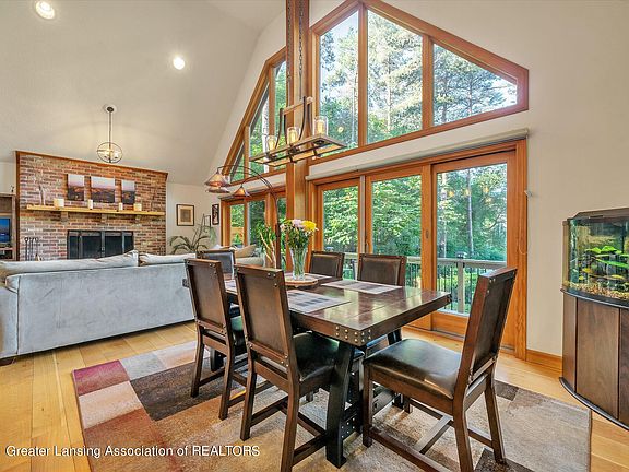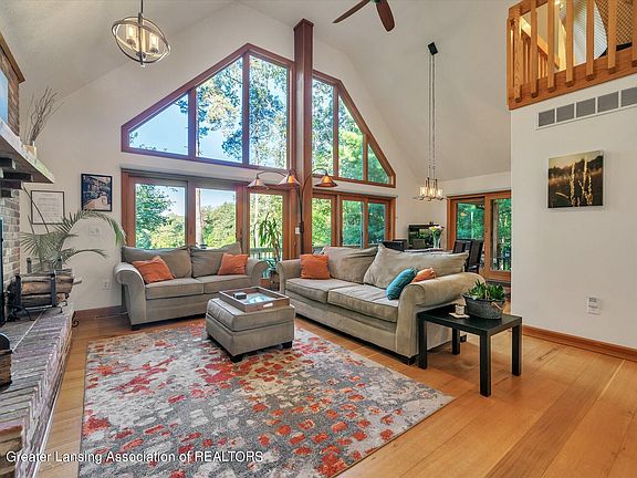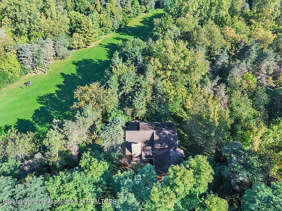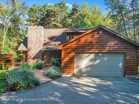 Woodsy * Private * on fairway 7 of Timber Ridge Golf Course * no HOAs * Haslett Schools and Bath Twp * Simply the Best kind of opportunity and living! Desirable open floor plan with high ceilings and voluminous windows provides a ton of natural light and 360 degrees of nature and privacy on 1.4 acres – year-round! Exceptional finishes include white oak quarter sawn floors, cherry cabinets, log-style exterior and interior finishes. Lovely main floor space has an impressive great room with a wood burning fireplace and accesses the deck while opens to the kitchen with snack island and dinette seating. Kitchen is plumbed for gas cooktop/range. There are two bedrooms and full hall bath and a back hall with generous storage and access to the oversized garage. The second floor loft overlooks the Great Room and can be your relaxing space or dedicated office. Down the hall is the spacious primary suite and deluxe tiled bath with dual vanity, tiled floors, whirlpool bath and step in shower. Downstairs is partially finished having a 3rd full bath (steam shower). The laundry and storage/mechanical room is great storage, and the remaining space would make a great recreation or home-gym. The outside is super special! A new deck in 2021 overlooks fairway 7 of Timber Ridge, has access to the main floor and wraps around to the backside of the home to a covered porch accessing the kitchen/dinette area. Landscape and gardens and fenced in area done in 2017, walkway in 2018 and privacy wall completed in 2019. New tankless water heater, furnace, and air filter in 2019. Great location, not far to I-69 or Costco! Country living with all the best of conveniences! Seller reserves the garage cabinet storage.