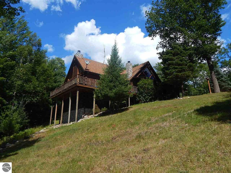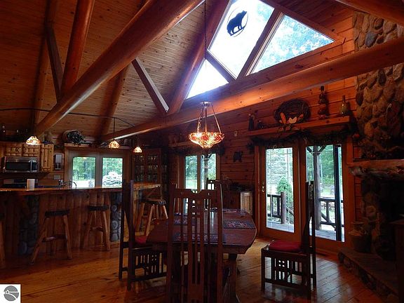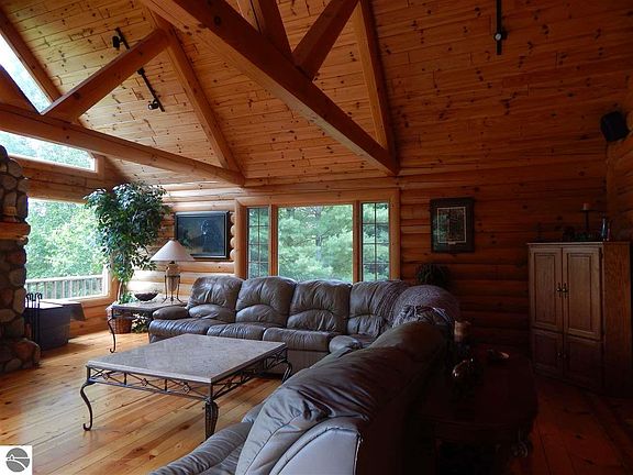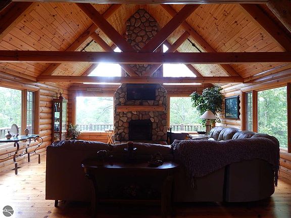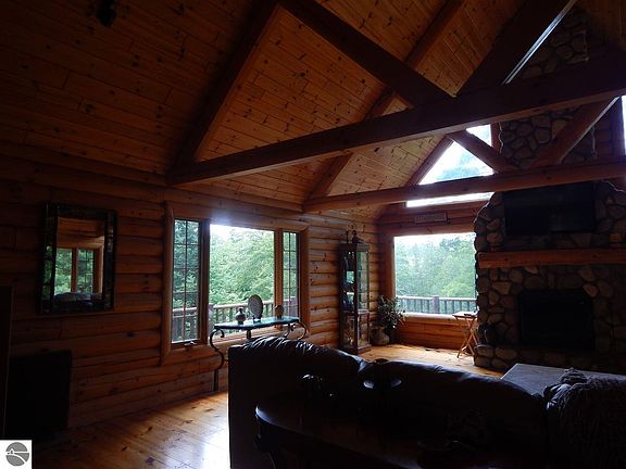 Its only right that a community founded with the lumber boom would be represented by a solid log home, on a heavily wooded and rolling property. The bonus of the upper Tittabawassee River running the entire western boundary (nearly 1000 feet) with some great trout opportunities and recreational uses as well as a magnate for wildlife make this estate sized property a perfect spot to enjoy all that Northern Michigan has to offer. The custom built full log home is situated on a hillside setting overlooking the river and pond. Extensive covered porch and decking will invite you to spend time outside and the 2 stone fireplaces will keep you warm in the winter. Pictures tell a thousand words but a visit is required to fully appreciate the quality of this home and property.