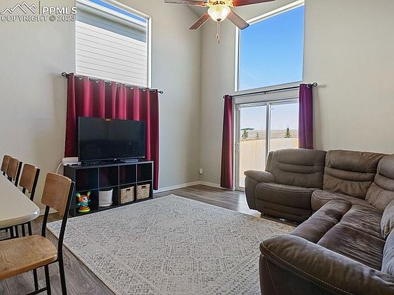 Welcome to your new almost new home in the highly sought-after neighborhood of Lorson Ranch. Vaulted ceilings, vinyl wood plank flooring thru out the first level. Kitchen with pantry open to the family rm. and connect with the dining rm. Main level master with walk in shower. Upstairs are 2 good sized bedrooms with walk in closets. Quartz counter in kitchen and bathroom. Minutes to Grand Mountain School Campus (K-8)