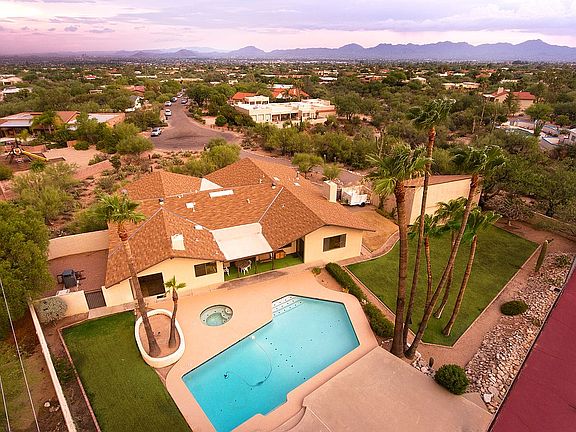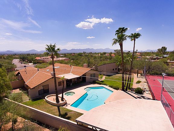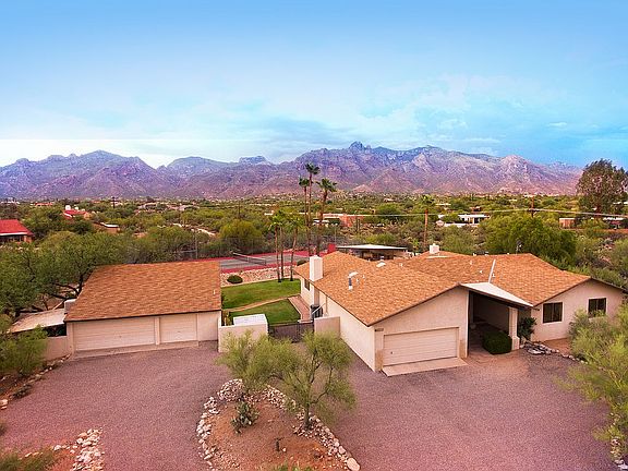 First time on market in sought-after Shadow Hills! Nestled on 1.15 acres at the end of a quiet cul-de-sac, this spacious 3530 sqft 4bd/2.5ba + 5 car garage home boasts the ultimate in resort amenities w/astounding Catalina mountain views! Swim laps in the expansive 40' pool, play tennis on the lighted court, relax in the spa and watch the mountains turn pink. Detached 3 car garage/shop provides 5 total garage spaces. Estate property presents an amazing opportunity to update to your taste on a premium lot in a top-rated school district. The master bedroom is a private retreat with beehive fireplace, office space, spa-bath and mountain views. Three additional bedrooms are all large (12x15) with walk-in closets. Appealing floor plan with sturdy 2x6 construction,