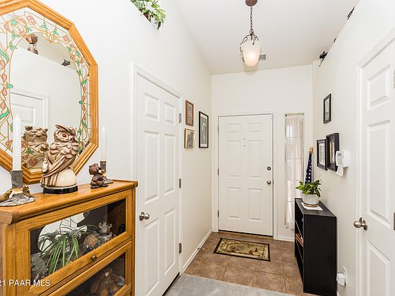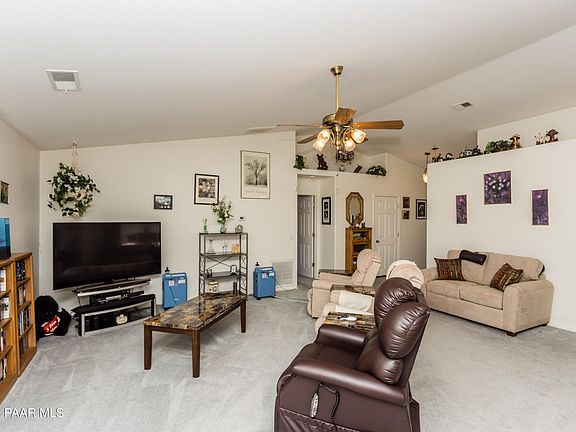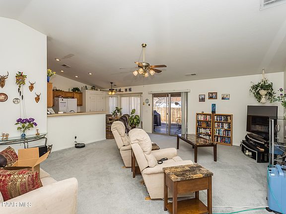 Well maintained ranch home in a premier N Prescott Valley area. Gas line and electric available for range and dryer. Seller has added ceiling fans in all rooms, paver patio, rock landscaping with new bushes & trees, privacy fencing, alarm system with glass breakage, motion and smoke detectors, windowa & doors. APS has installed solar panels for heating. Purchaser may continue montly service or APS will remove the system at no charge & repair any damage. Carpet and tile floors throughout, RV parking with full gate to backyard on South side of home. Vertical blinds in all windows. Kitchen with pantry, WIC in master, 3rd Bdrm used as office. Shed offered. Home has rain gutters. Don't miss this expectional value close to shopping, schools and Highway 69. No HOA. 2HR Notice to Show.