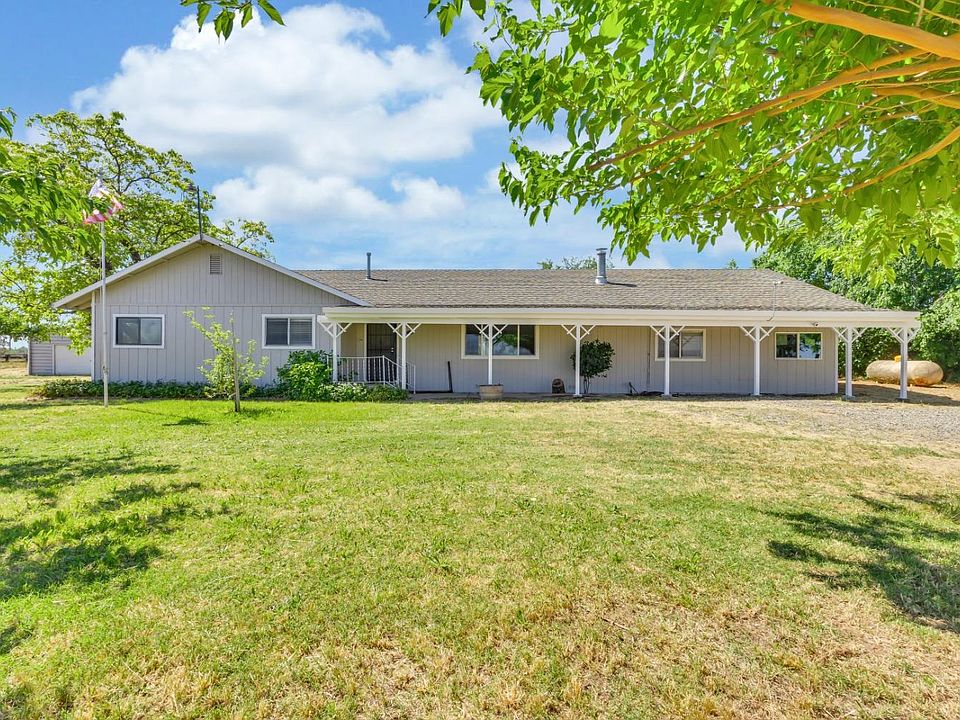 Escape to epic sunsets and wide open spaces on this sprawling 4.8-acre property, just moments from the convenience of town. This classic ranch home boasts nearly 2,900 sq ft of living space, offering ample room for family, hobbies, and entertaining. Step inside to a light and airy feel, accentuated by the recently painted interior and new carpeting. Soaring open beam ceilings grace the living and dining areas, along with the warmth of a wood-burning stove on chilly evenings. The expansive layout features 4 bedrooms and 3 bathrooms, with an additional 2 rooms that offer exciting possibilities. Convert them into extra bedrooms, create a dedicated home office, or even convert them back to an attached garage - the choice is yours! Embrace the country lifestyle with summer barbeques on the patio, explore the natural surroundings, or simply relax and soak in the fresh air. The property also includes a convenient 20x20' metal outbuilding with roll-up door, perfect for storing tools, equipment, or recreational vehicles. 36 solar panels help offset electricity costs. Don't miss this opportunity to own your own ranch, with no HOAs, and no Mello Roos! See this one today!
