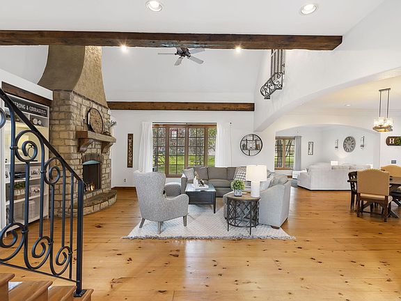 This stately 4-bed, 3.5-bath home features timeless French Country stylings surrounded by custom homes that emulate a European countryside lifestyle with all the amenities in the coveted Millwood community, known for distinctive, luxury living with an 18-hole championship golf course and private clubhouse. The spacious 3-car garage sits adjacent to the grand entrance with river-rock inlaid steps flanked by stone pillars set against a stone and brick facade surrounded by picturesque landscaping. Inside are natural finishes, wide plank knotty pine flooring, tall ceilings, neutral color palettes, and walls framed in thick crown molding. The living room has cathedral ceilings with stout wood beams, a stunning floor-to-ceiling stone fireplace (gas), and large colonial-style windows. The home's open layout seamlessly connects the living room to the chef's kitchen and dining area, creating an effortless flow. The kitchen features stainless steel appliances, a five-burner gas range, exquisite French-country cabinets with quartz countertops, and an oversized island with seating, a secondary sink, and additional storage. Adjacent to the kitchen, the spacious mudroom boasts brick flooring, abundant storage cabinets, a deep-set sink, a walk-in pantry, and convenient access from the garage.The stately master suite offers a private haven with a door leading to a secluded covered patio. The master bath boasts walk-in closets, an oversized tub, and double vanities adorned with granite tops. Adjacent to the master suite is a versatile office space.A mezzanine upstairs overlooks the living room and is situated between two very spacious bedrooms, each featuring large closets, cozy carpeting, and delightful views while ensuring the upper level provides comfort and privacy for all occupants.Located just off HW 65 for swift access to Springfield and Ozark amenities, this exquisite home balances luxury with modern comfort for refined living. Schedule your showing today!