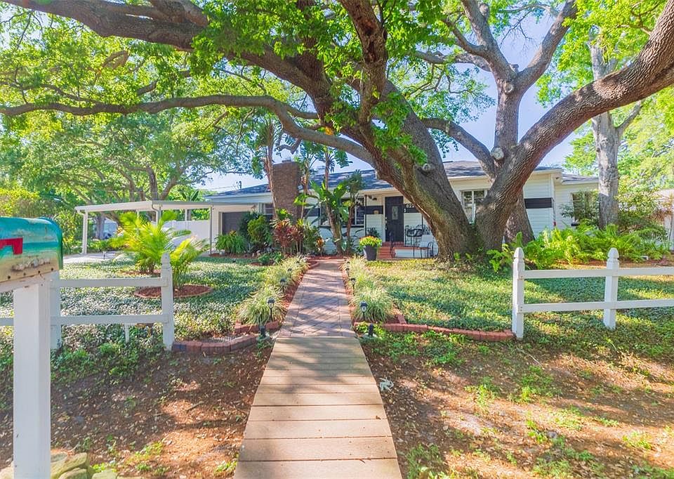 PREMIER SOUTH TAMPA LOCATION! Just minutes from Bayshore Blvd, Ballast Point Park, shopping, dining, and MacDill Airforce Base, you can enjoy all Tampa has to offer right at your finger tips! This 4 bedroom, 2 bath home is a true oasis situated on a spacious corner lot surrounded by lush landscaping and mature trees. As you step inside the home, the large picture window lets in an abundance of natural light to the combined dining room and living room. The hardwood floors and brick wood burning fireplace create an inviting feel keeping to its original 1952 charm. Leading into the heart of the home, the kitchen has been tastefully remodeled in 2022 to include updated cabinetry, ceramic tile flooring, and stainless steel appliances. Just off the kitchen is the inside laundry room and door leading out onto the covered, screened-in lanai. The lanai is complete with a sink, perfect when entertaining and overlooks the secluded, fully fenced backyard. Plenty of time will be spent outside relaxing on the large pavered courtyard, enjoying a meal alfresco or taking a dip in the above ground POOL. Brick lined pathways lead to the storage shed which is fully equipped with electricity and a double gate opens to the nearby secondary carport conveniently located next to the water hookup for easy washing of all of your cars, boats or RVs. The primary bedroom was converted into a true 4th bedroom in 2019 boasting beautiful Saltillo tile, two closets, peaceful views out to the backyard and ensuite with dual vanity sinks, walk-in shower and linen closet. Down the hall the remaining 3 bedrooms and full bath are tucked away for added privacy. Updates include a NEW ROOF (2024), main water line replacement (2023), exterior/interior paint (2022/2023), drainage system (2021), pavers (2020), fence (2019), irrigation system (2019), landscaping (2019-2022), popcorn ceiling removal (2019), washer/dryer (2019), driveways (2019), A/C unit (2015), and a tankless hot water heater.