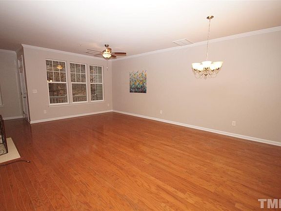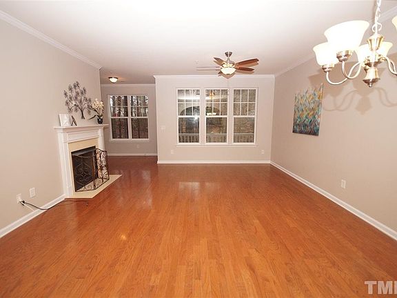 Loaded w. Upgrades! 3 BRs+Bonus or 4th BR. Hardwoods Galore, Fresh Interior Paint/Carpets, Granite Kitchen w. SS Appliances incl Gas Range, Tile Bksplsh, Rich Cherry Cabinetry. Open Floor Plan! Living Rm has gas fireplace & lots of windows. 2nd Level offers Master plus 2 add'l BRs. Tray ceiling Master Suite w. WIC & spa-like tiled Bath. Lower Level Bonus is pre-wired for home theater. Patio & Porch overlook flat yard w. wooded rear buffer. Popular Pool/Fitness Community in unbeatable NW Raleigh locale!