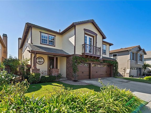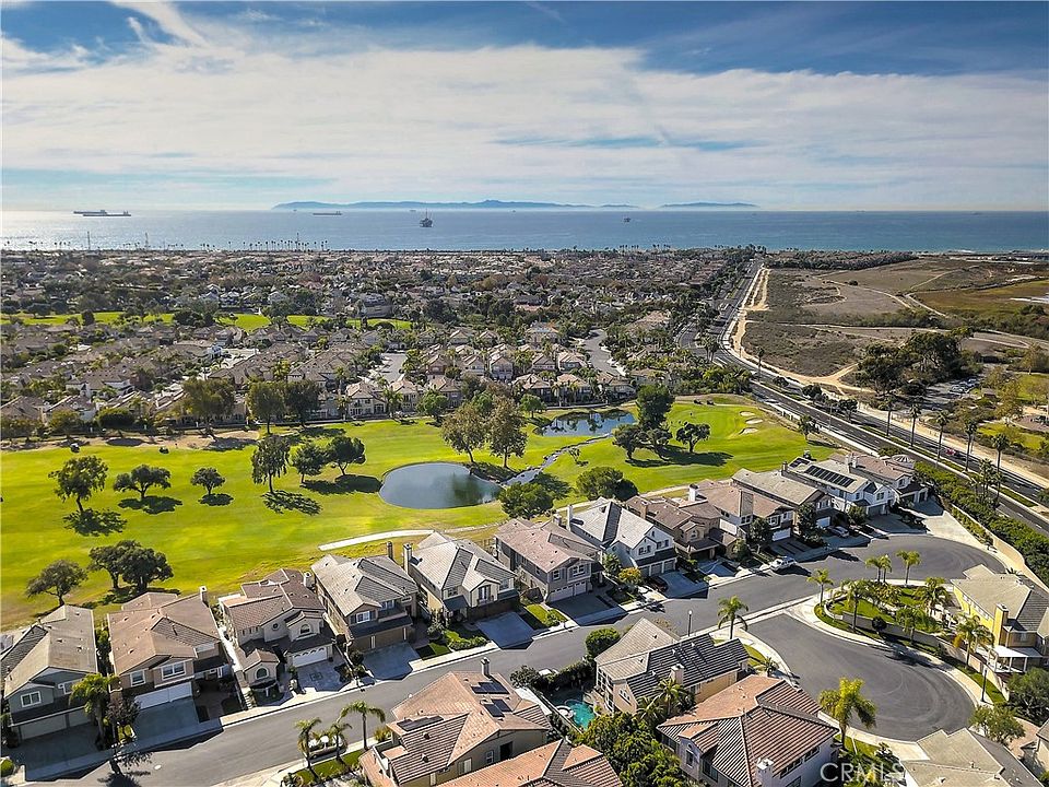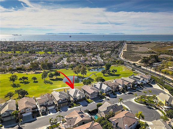 Located in the prestigious Peninsula community, this beautiful home offers luxury, comfort, and an open floor plan with unobstructed views of the Huntington Club golf course from several rooms, and peek-a-boo views of the nearby ocean. Watch the sunset from your private primary bedroom balcony. Natural light highlights the interior's high-end custom upgrades including, wood floors, crown molding, a marble entryway, and an elegant staircase. A gourmet chef's kitchen with custom cabinets, Taj Mahal quartzite counters, and state-of-the-art Bosch appliances, opens to the family room with seamless access to your patio, perfect for outdoor entertaining. The spacious primary suite has spectacular views from the bedroom and the adjoining spa-like bathroom with a jetted tub. Lifestyle features include a main-floor bedroom ensuite, dining room, powder room, and second-floor bonus room, with 2 additional bedrooms and a 3-car garage with ample storage. This upscale neighborhood is within walking distance of award-winning Seacliff Elementary, near parks and lovely beaches. This unique turnkey home on the golf course is the one you have been waiting for!