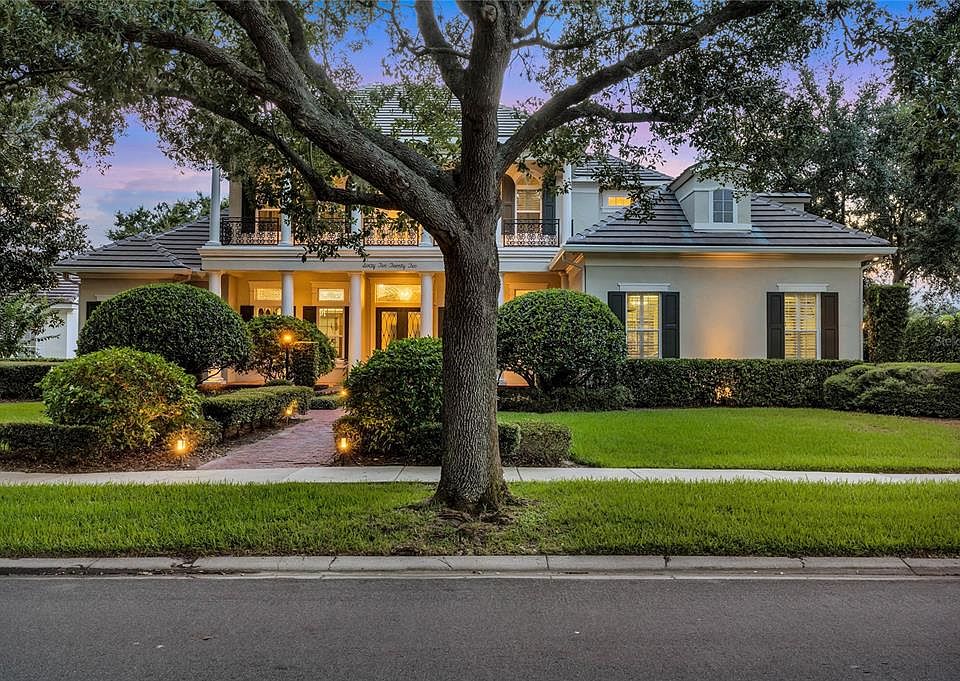 Prepare to be inspired by this Georgian-style estate, deep inside the sought-after Windermere neighborhood of Keene's Pointe. With elegant touches and major upgrades throughout, this home is truly a dream come true. With over 6,000 sqft, this 5 bedroom, 5 bath home offers a spacious yet inviting layout that draws you in from the moment you step through the stately double doors. As you enter the home, your eyes are drawn through the formal living and towards the backyard, with stunning natural light and whisps of the golf course views. At the heart of the home is a perfectly curated living and kitchen space, with a family room that offers a gas fireplace, sweeping windows, and plenty of room to entertain. The refreshed chefs kitchen offers plenty of counter space, prep-sink in the island, pendant lighting, custom hood, and an oversized walk-in pantry. The main level primary suite offers an impressive retreat with dual walk-in closets, soaring ceilings with detailed crown molding, lanai access, dual sinks over marble counters, large soaker tub, and an oversized shower. Other first-level features include a wine room adorned with brick and wrought iron, wet bar connecting the formal dining and kitchen, private office with wood-paneled walls and stunning chandelier, guest suite with an updated bath, and a game room with vaulted ceiling and craftsman level finishes throughout. The second floor offers a home theatre w/ inwall sound and blackout curtains, jack-and-jill bedrooms with a balcony overlooking the tree-lined street, and an enchanting guest suite with golf course views, walk-in closet, and a stunning bath with marble tile and frameless shower door. Your new backyard escape offers a saltwater pool/spa, covered lanai with automatic rolldown screens, and a well-appointed summer kitchen. Significant recent upgrades include a slate tile roof (2019), newer AC units, doors and windows (2023), exterior paint, and so much more. Enjoy all that Keenes Pointe has to offer with two 24-hour manned gates, lake access, pool and recreation areas, basketball court, playground, nature paths, and a recreational vehicle/boat storage. Golf and social memberships to the Golden Bear club are also available! Be sure to view the full virtual tour and call to set up a private showing today!