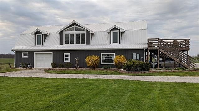 All the privacy you could want is here! This Barndominium/2 story home sits secluded on 20 acres. Walk into the 2nd floor from a beautiful deck before you enter the open floor plan living space. When you walk in you immediately are in the family room. Then you will reach the kitchen that features a double oven and farmers sink, stainless steel appliances, and an eat-in dining room. 3 Bedrooms on upper floor, with 4th on the lower and a 5th non-conforming bedroom or office. SO many upgrades were added we had to attach a list!