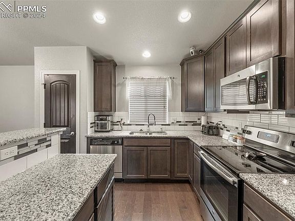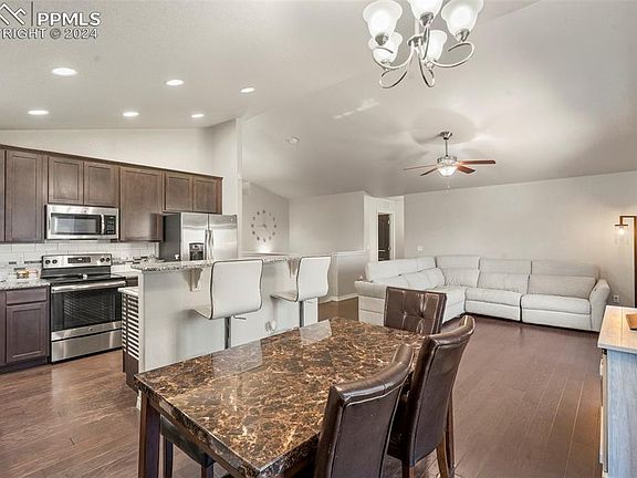 BEAUTIFULLY MAINTAINED AND LIKE NEW Ranch Home with main level living is ready for your family to make new memories in! The gourmet kitchen features granite counters, large counter bar island, opens to dining and living room with walk out to private fenced backyard where you will enjoy pond water feature. Also on main level is primary bedroom with adjoined 5 pc bath and large walk in closet. There is ahother bedroom and full bath. The fully finished basement has large family room, 2 additional bedrooms and fully bath. This home is close to Fort Carson, neighborhood school, parks, hiking trails, shopping, restaurants and easy access to I-25.