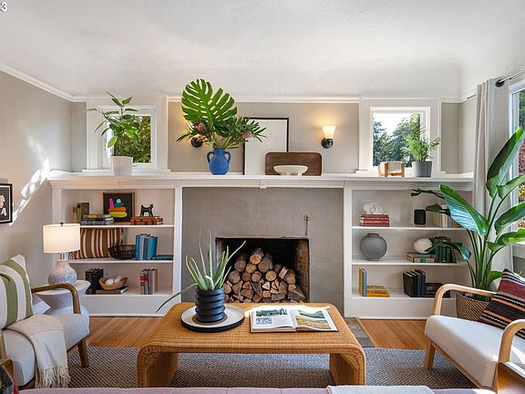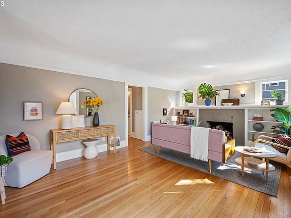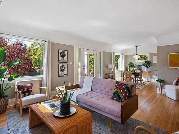 Poised across from Peninsula Park, a 1913 city treasure retained from Portland's City Beautiful Movement, with its picturesque fountain, plethora of roses, playground, community center, basketball courts and pool. Enjoying a 100 BikeScore, this time-honored bungalow features a permitted treetop ADU and a dazzling lower-level living zone! Step through the robust glass entry door with sidelights, into living spaces with natural light streaming in from three sides. Relax in front of the fireplace and watch the light dance across the original oak floors. The tiled kitchen has stainless steel appliances and a new sink with integrated tools. Flanking the hallway are two spacious bedrooms, ample closets, a classic bathroom and the original stairwell that could readily reconnect the house and ADU if you are seeking more togetherness. Teens, housemates, in-laws? No problem! A world awaits downstairs with a common area, washer/dryer, two more bedrooms and a sleek bathroom with heated floors! Check out all the storage, two electrical meters/panels and two water heaters, including a hybrid solar/electric unit. Around the back, you'll find a staircase up to an alluring two-bedroom flat with refinished fir floors, new carpet, skylights, new appliances and in-unit laundry! Backing to an alley, the large garage can be restored to hold a ton of gear, vehicles, or jammin' indoor/outdoor living. The fenced private backyard's centerpiece: a fruitful apple tree! Great for multi-gen living or short term rental in the lower level. Move in ready, with room for your finishing touches.