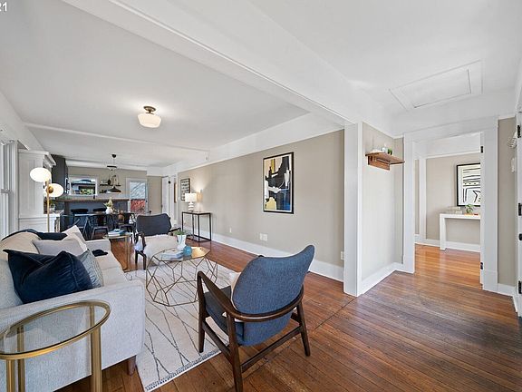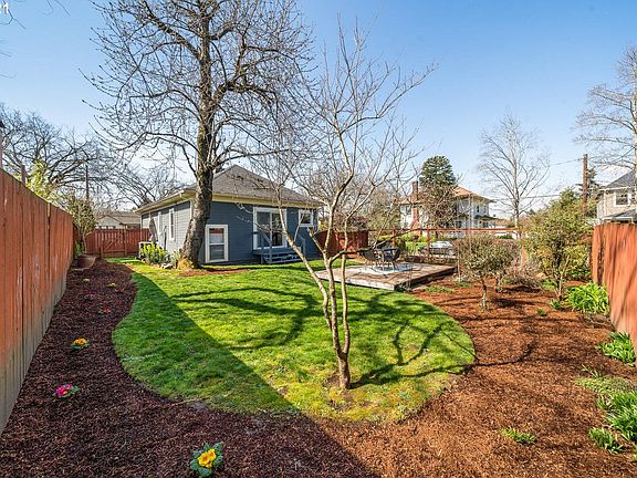 Sought after private elevated corner lot on lush Omaha Treeway with lovely upgrades and enormous fenced backyard w/newer deck for gardening and play! Newer high-efficiency furnace, fresh paint, new carpet, remodeled kitchen with live edge wood bar and quartz, extra storage and gorgeous light throughout. Enjoy an expansive great room layout, hardwoods, bike score of 98 and central to East/West and downtown with classic PDX neighborhood feel. Shopping/dining/public transit and park nearby, so walkable in Arbor Lodge!