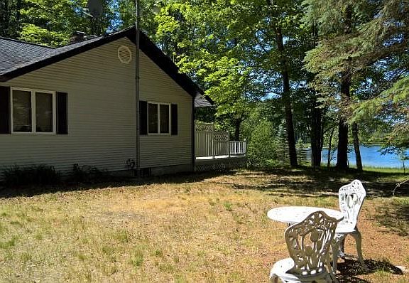 Quiet, tranquil no wake Ranger Lake..electric motors only ..lots of fish..bass, pike, blue gill, sunfish..and beautiful Loons Well built for year around living is this 2 Br 1 Bth home with hot Water Baseboard heat..even in basement..2x6 walls with triple insulation in ceilings..beautiful tongue and groove ceilings thruout home..open floor plan plus formal dining room..2 bay windows add to the charm of this cozy home! full unfinished basement, main floor laundry..corian in kitchen.. new hot water heater.... water softner and..4'' well . Doorwall out to your large maintenance free deck that overlooks beautiful Ranger Lake..Attached garage thats 26x26 to hold lots of toys...and vinyl siding for low maintenance...bring your fishing gear and come on out!! 1.38 acres.. Dock is not included. Dock is not included...survey markers are new but that small strip of land is deeded with family neighbor...to the right...plats are available from agent Buyers and their agents to verify all info.... Parcel next door is available to the south