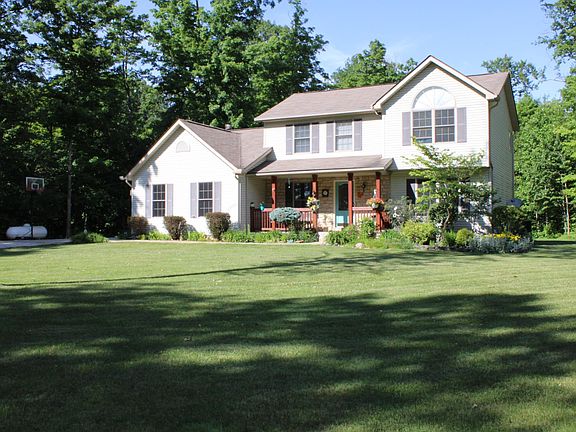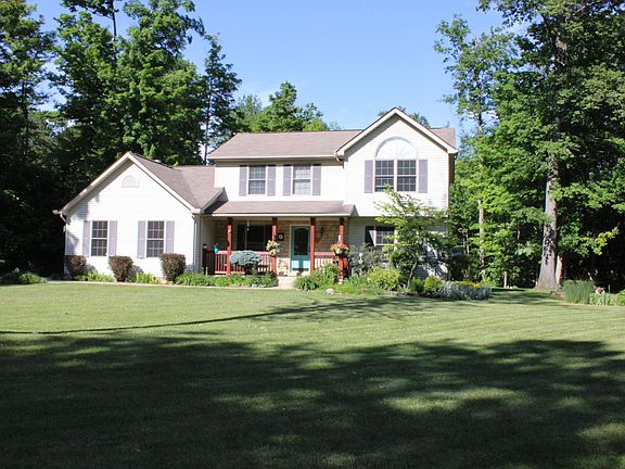Own your own park! Fabulous 2 story home, nestled in 10.93 acres of woods. Spacious great room with fireplace, overlooking manicured lawn with Koi pond, terraced decking and firepit. 36x30 Amish built pole building with 2 stalls and walk up loft, perfect for mini farm. Covered front porch to enjoy the serenity. Formal dining room, spacious master suite with garden tub and shower. 1st floor laundry. Full basement, partially finished, adds approximately 700 sq ft of additional living space, including family room and craft room.