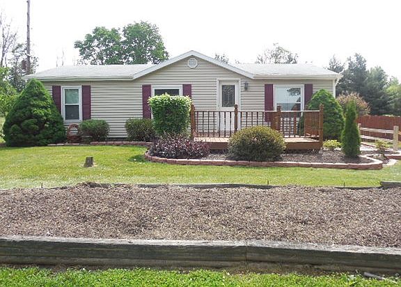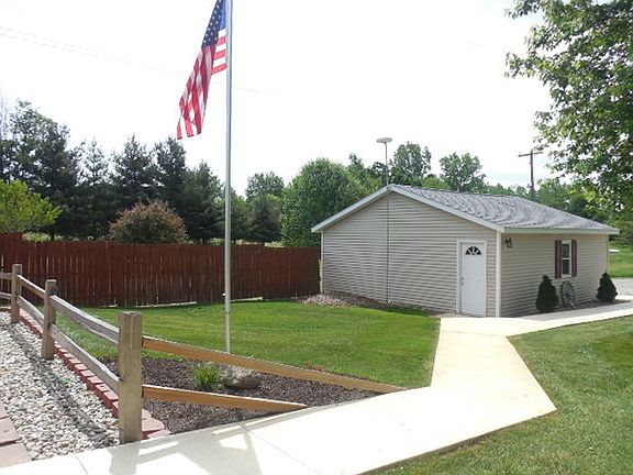 Three acres with privacy! Trees and fence on entire border. Wonderful deck space for summer cook-outs! 3 bedrooms, 2 full baths. Walk-in closet. Detached garage is finished - used as a shop and "man cave" right down to the garage TV connection. This house is well cared for and move-in ready. Kitchen and living room combine for open feel & vaulted ceiling. Updated siding and windows - new flooring including ceramic tile & laminate. Country location, next to a farm field – lots of deer. Firepit in backyard. Well planned sidewalks, landscaping & driveway. Easy access on Hwy 3 to Kendallville, LaGrange & Angola. Mature shade trees, + peach & apple trees. Close to several lakes.