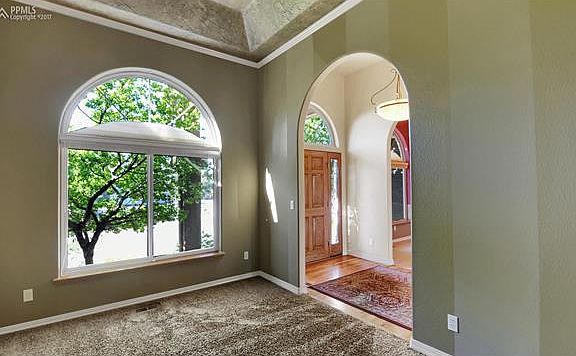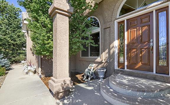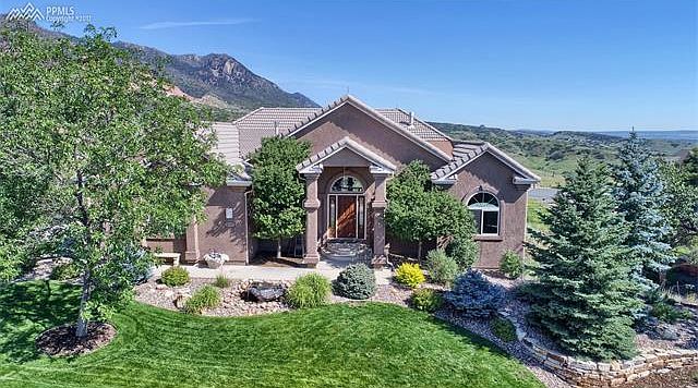 Beautiful custom rancher perched high on a private ridge top in upper Mountain Shadows with spectacular mountain and city light views, walking distance to Pikes National Forest*Street scape enhanced by the new stucco overlay, and paint, new Milgard windows, along with the oversized side load 3 car garage and tile roof *Hardwood entry opens to the formal living w/ coffered ceilings and dining rooms with faux painting accents*large kitchen w?hardwood flooring, medium maple cabinets, pantry, counter bar opens to the ...... breakfast nook and family room with a gas log FP, that walks out to a covered redwood deck, tall pines and open green spaces*Owners suite is tucked nicely in the back of the home offering a very private space, with a 5 piece master bath and walk-in closet w/ built-ins*2 additional bedrooms and an office, laundry room, full bath complete the main level*completed walk-out basement has 10' ceilings; recreation room, media/game room, w/a step behind wet bar w/ natural cherry cabinets & a second gas FP, 2 additional spacious bedrooms, full bath and storage*Show today!