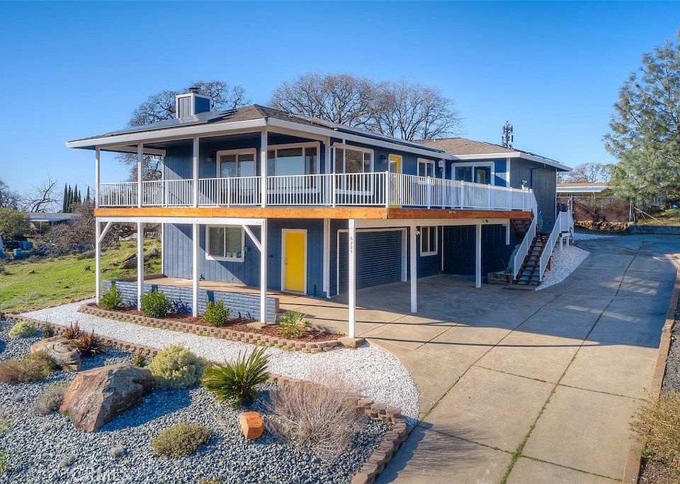 This home has the most breathtaking views of Lake Oroville and Bidwell Marina!! You will feel like you are on vacation year round. Spend your mornings sipping coffee on the porch watching the sun rise through the mountains and reflect over the water. The oversized porch and large windows offer a wonderful blend of indoor and outdoor living. The kitchen, dinning, and living rooms are one large open space perfect for entertaining and functional living. With modern flooring and fresh paint the space is move in ready. The top level of the home offers separate laundry room guest bedroom and bathroom and a huge primary suit with private bathroom. The bottom level features a full 2 car garage with utility sink, a bedroom and bathroom. Recent upgrades include new windows throughout, front and back porch renovations, new hot water heater and low maintenance landscaping. There is a leased solar system on the property with a power purchase agreement only paying $0.2036/kWh less than half of PGE cost. This home has so much to offer with its modern look and breathtaking panoramic views.