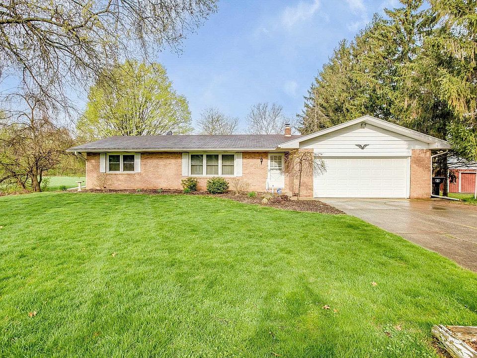 Country Setting! Wonderful tree-lined yard with covered patio! Brick ranch home with 2 bedrooms and 1 1/2 baths. It would be feasible to add another bedroom on the 1st floor or the basement. Spacious eat-in kitchen with newer vinyl flooring, breakfast bar, newer countertops, like-new stove, refrigerator, and new dishwasher plus a dinette/family room with fireplace. Big living room flows into dining / flex room. Vinyl windows new in 2018. Full bath with walk-in shower and linen closet. Bedrooms with ceiling fans / one bedroom has double closets. Remodeled 1/2 bath. Almost-full basement has some partially finished rooms plus a shower and sink. Whole home generator, newer (2015) hi-efficiency furnace, central air and humidifier. Newer leaf-guard gutter screens. New well motor 2022. Attached 2 car garage with newer opener.
