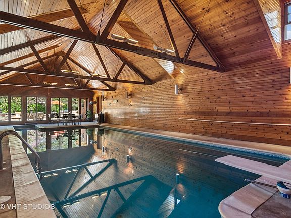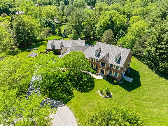 This gorgeous all brick home with a new synthetic roof is situated on a glorious 2.8 acre wooded cul-de-sac lot with lush landscaping and beautiful views of nature in District 96 and Stevenson HS districts. Enjoy entertaining year around in the separate pool house with in-ground pool and swim lane, opening to an expansive brick patio with outdoor kitchen with pergola, hot tub and fire pit! There's space for everyone with 2 home offices on the first floor with 1.5 baths for the occasional house guest or pool users. The walk-out lower level has tons of light and a tall ceiling with a full bath, wet bar/kitchen and 5th bedroom. The heart of this home is in the open kitchen/breakfast room/family room, with walls of windows overlooking the stunning backyard views. The spacious kitchen is a dream for the inspired chef, with an abundance of counter space, newer stainless steel appliances, and extensive cabinetry. The family room features a brick fireplace and hardwood flooring. Heading upstairs, there are four spacious bedrooms with walk-in closets and two full baths. With gorgeous flowering bushes, a lower patio off the walk-out basement doors, and expansive lawn space, this property offers privacy, space and a connection with nature. Enjoy picking fresh fruit from apple and peach trees, and walking on your own nature trail. Located just 3 miles from historic downtown Long Grove with its plethora of festivals, shopping and restaurants, this home has it all. Welcome home!