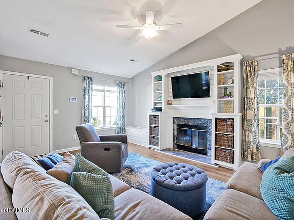 Stunning 3-bedroom, 2-bathroom home with an open floor plan, with 1321 square feet of meticulously designed living space. As you step inside, prepare to be impressed by the seamless blend of sophistication and coastal charm. The heart of this home is the newly renovated kitchen - a chef's dream come true. Featuring a beautiful center island with luxurious quartz countertops and shiplap detail, perfect for food prep or hosting a large group. The dining room is anchored by a charming bay window. Relax in the spacious living room, boasting a custom-built entertainment center that frames the cozy wood burning fireplace with shiplap details, built-in shelving, and tons of storage. Whether you're hosting a movie night with loved ones or simply unwinding after a long day, this inviting space sets the perfect tone for relaxation and enjoyment. The sleek LVP flooring throughout the main living area adds a touch of contemporary flair while ensuring easy maintenance and durability for years to come. The spacious master suite includes a private bath, convenient vanity and walk in closet. A secondary bedroom offers french doors to the new deck providing the perfect spot to sip a refreshing drink and soak in the tranquil, private surroundings. This room would work well as a home office or even a home gym too. The third bedroom is large and offers an abundance of closet space. Step outside into your own private oasis, where a large, fenced yard awaits. Ideal for both four-legged friends and outdoor entertaining, it offers ample space for recreation and leisure. There is a storage shed that's perfect for keeping yard equipment and beach chairs! Low HOA and quiet street, just minutes to shopping at Mayfaire and Wrightsville Beach!