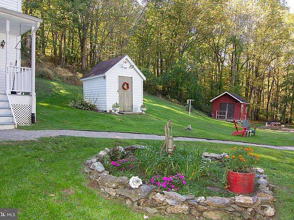 Welcome to this unique, charming, and nostalgic home with the mix of the original and beautiful added addition and updates situated in a park-like setting on a 2.85 acre treed lot. The original home was built in 1875 and the addition was added in 2002. With approximately 1,906 sq ft of finished living space, there are 2 BRs with an office/possible 3rd BR on the upper level. The home has hardwood floors on the main level, knotty pine paneling in the living room and solid wood trim throughout. The spacious primary BR is part of the addition, with vaulted ceiling, full bath with shower, large walk-in closet, and an atrium door to the upper deck. There is an all-season sunroom in the front of the house with an exit door to front yard. The spacious kitchen has plenty of cabinets, propane gas stove/oven, double SS sink, slider to covered front porch (18 x 6). The Dining Room is off the kitchen. Entering the family room where the original curved wood staircase is to the upper level. The first-floor laundry is off the living room that has a double utility tub and washer and dryer. There is dual zone heating and cooling with FHA propane heat and heat pump. There are 4 outbuildings; 21 x 23 ft garage for one car and large with workshop and attic storage; garden shed, tractor shed and a 15 x 11 He/She shed that can be used as a game room, craft room or office. The creek bed/stream in the front yard has 2 wooden bridges to cross over from the 4-car parking pad. The home and property have been lovingly cared for by the owners. All appliances and a 1 yr basic Cinch Home Warranty is included.