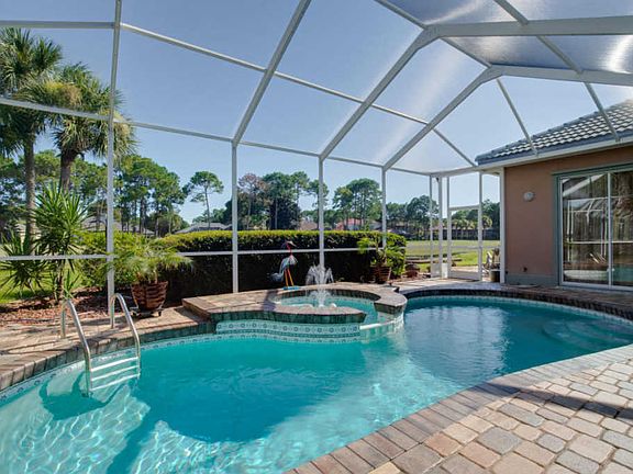 A must see home! Custom built by Boswell Builders of Destin in the prestigious gated golf-community of Emerald Bay, this remarkable 3 bedroom, 2.5 bathroom home, overlooks the 5th fairway and lagoon of this stunning golf course. This open and airy floor plan features a large kitchen with granite counter tops which overlooks 2 large living areas and spacious dining room. A marble fireplace with cozy, gas logs in the living room, built in shelves and cabinets lining the dining room walls, along with high ceilings, crown molding and plantation shutters combine to create a beautiful living space perfect for entertaining. The amazing enclosed lanai & pool provides more space for family or guests to enjoy. The master bedroom and bathroom are a private sanctuary