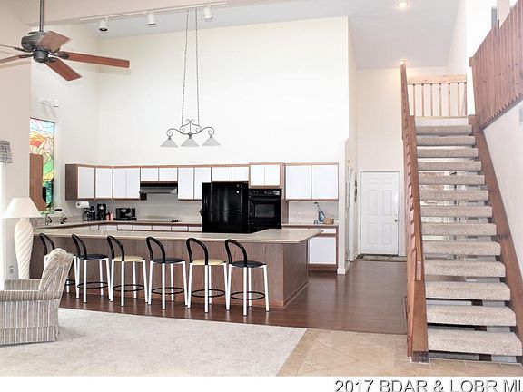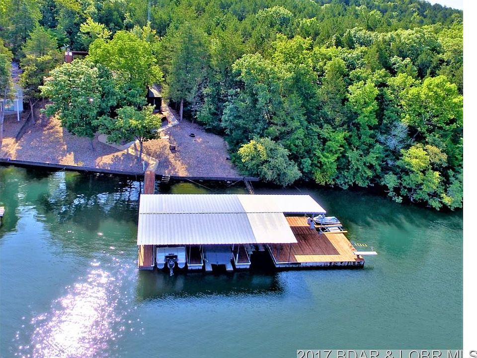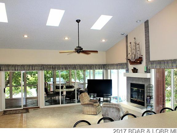 Stylish 2 1/2 story contemporary waterfront home will please the entertainers and easily accommodate the extended family. Main level living captures an abundance of light from lakeside glass, tall vaulted ceilings with skylights and open floor plan. Cozy up to the wood burning fireplace, gaze across the cove or watch main channel activity from within, screened deck or open deck seating. Tiled kitchen boasts extended breakfast bar, dining room is lakeside and living room pulls them all together. A unique loft offers play area for the children plus huge bonus room becomes an in house dorm. Walkout lower level includes 2nd Master Suite, 3-guest bedrooms, two full baths & family/game room. Storage room, sidewalk to dock & covered parking, too!