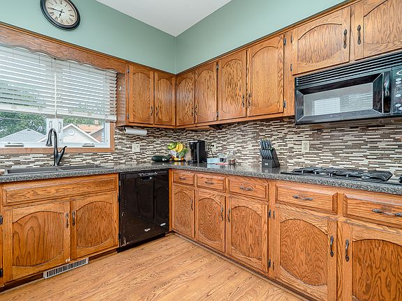 This stunning home is nicely updated & boasts over 1,700 square feet feet in living space! This home has it all! A cozy enclosed front porch to greet you; Huge, sun-filled living room with laminate flooring & built-in book shelves; Formal dining room with chair rail & cozy window seat; Large kitchen with oak cabinetry, all appliances, custom backsplash & pantry; First floor bedroom thats great for an in-law arrangement; Two Spacious second floor bedrooms with walk in closets. Enjoy the finished basement, with built in office space & recreation room; Covered back concrete patio overlooking the privacy fenced yard is perfect for entertaining. Plenty of parking & 2 car garage too!