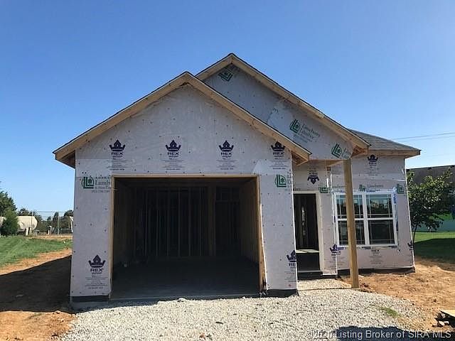 New construction, 3 bed, 2 bath, open floor plan, kitchen, dining room area, great room, mud room, granite kitchen and bathroom counter tops, stove, refrigerator, microwave, dishwasher appliances all stainless steel. Bedroom carpeted only city utilities. Located convenient to shopping, restaurants, 20 mins to Louisville, KY. Completion date on or before Dec. 15th 2020. Copy of house plans and survey available.