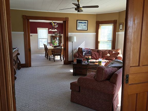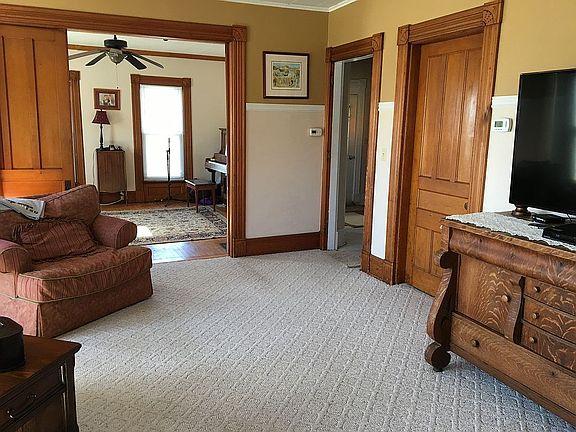 In the heart of Clayton, this spacious village home has an airy, open, light and bright feel, with a view of the St. Lawrence River from 5 rooms (up and downstairs)! Grand rooms have 9 ft. ceilings; sliding pocket doors add grace and charm. There is a workout room in the basement; vinyl floors throughout, breakfast bar and Corian countertops are in the kitchen; large bonus room upstairs could be used for an office, bedroom, entertainment room, studio, play room, etc. The home could be two apartments (again) with a second staircase still intact. A large side lot is perfect for a new buyer to build a two-car garage. This well-kept home offers unique beauty and easy accessibility to the river and village.
