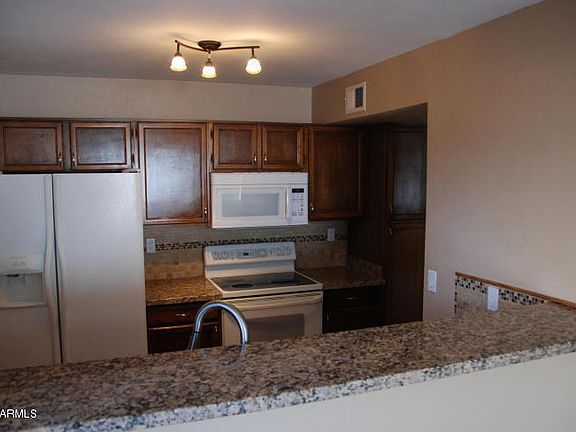 Granite counter tops, breakfast bar & tiled back-plash. Wood flooring and ceramic tile in common areas. Large living room & dining room. Single story, ground level unit. Great location and quiet at south end of the complex. Walled-in patio w/storage room. Complex has 2 community pools/spa. Convenient location - 2 miles to Price Frwy and Frwy 60. Shopping & restaurants nearby. **Dobson High less than 1 mile away Agents PLEASE read private remarks