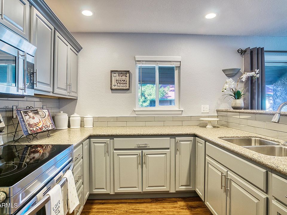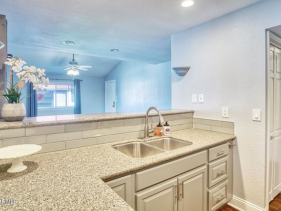 I'm gorgeous and move in ready! This unit is the biggest and nicest unit in the complex. Remodeled kitchen with raised panel cabinets, quartz countertops, new stainless steel smooth top range, built-in stainless-steel microwave, new stainless-steel refrigerator with ice & water in the door, can lights & gray subway tile back splash. New paint, Luxury vinyl flooring, and 5 1/4 '' baseboards. Bathrooms have been remodeled with vessel sinks, marble-look quartz countertops, wainscoting, tile shower and tile bathtub surround. Many extra features including satin nickel trim, master bathroom barn door, window trim, vinyl dual paned windows, popcorn ceiling removed and a new water heater. Complex includes lush green grass, and 2 pools. 2 assigned parking spots, one covered, one uncovered