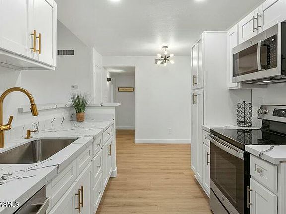 Experience modern living in this beautifully updated condo located in an impeccably maintained community! This light-filled home boasts stunning upgrades throughout, including brand-new kitchen and bathroom cabinets topped with sleek quartz countertops, all-new flooring, stylish light fixtures, updated plumbing fixtures, new ceiling fans, and stainless steel appliances. Fresh interior paint and updated baseboards add a polished touch, while the spacious laundry area offers convenience. Enjoy the privacy of your own patio with additional storage and the charm of vaulted ceilings. The primary suite provides a peaceful retreat. The community features lush green spaces and two sparkling pools, perfect for relaxation. Near 101/ 60 interchange great location.