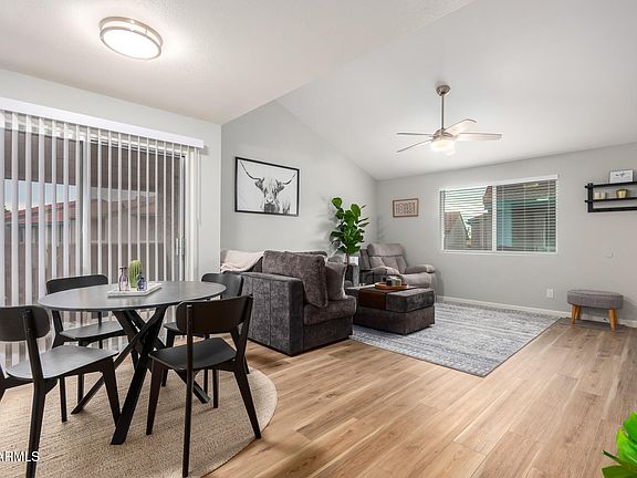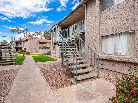 Beautifully remodeled home with vaulted ceilings, neutral paint and natural hickory vinyl plank throughout! Desirable end unit nestled in the middle of the complex and is one of the larger in living square footage. Stainless steel appliances including a new refrigerator and microwave. Both bedrooms have walk-in closets! East side balcony faces pool, close to covered parking, and has a storage shed off balcony. Conveniently located close to MCC, ASU and 101, US60, I-10, restaurants and shopping. 2 community pool areas to the east and west of unit. Come see this gem today!